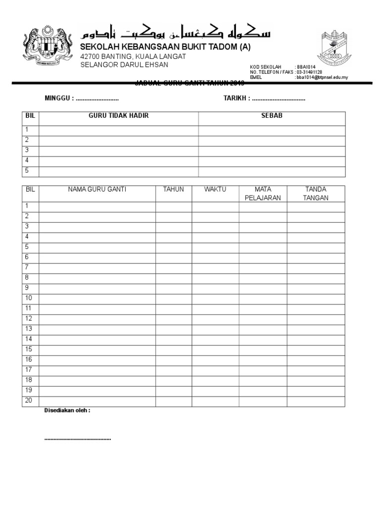 Jabatan Pendidikan Negeri Selangor KETUA JABATAN Nama. Buku persediaan mengajar dan rekod-rekod pelajar perlu disediakan dan diselia seperti yang dilaksanakan oleh guru yang digantikan. Nama Guru _____ Guru Diganti_____ Matapelajaran _____ Masa Ganti_____ Kelas Diganti_____ Masa Ganti _____ Kelas Diganti_____ SEKOLAH KEBANGSAAN TAMAN PANTAI SEPANG PUTRA 43950 SUNGAI PELEK SELANGOR DARUL EHSAN NO.